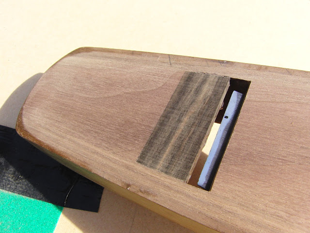 Since I'll shortly be tackling some figured maple for the making of a hand plane, I thought it would be a good idea for me to close the mouth on a wooden plane I already made. Whilst it functions admirably, there is room for improvement. I had a couple of ebony offcuts that were tidied up on the shooting board (already worth its in Gold) and set about removing some wood from the sole.