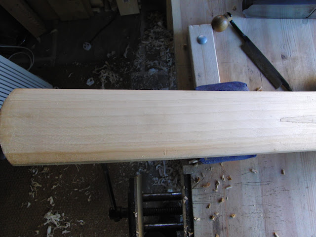 Well, the repair of my own bat has taken a back seat as I've now begun another bat for someone from Australia. After quite a few emails back and forth, we settled on a suitable cleft and today I took the first tentative strokes with the drawknife.